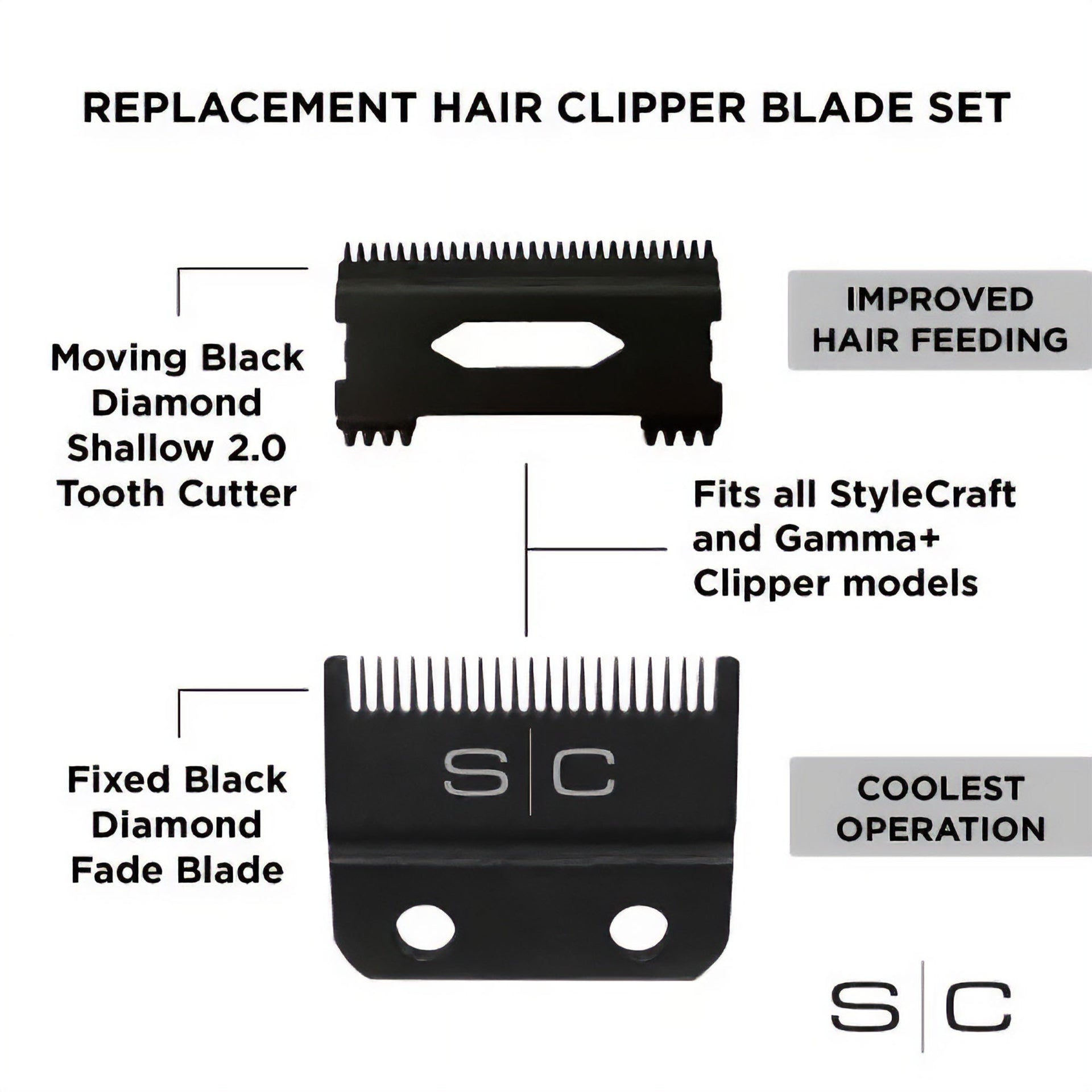 The StyleCraft SC Clipper Blade DLC Fade Blade and Shallow Tooth Cutting Blade Set is designed for professionals seeking superior cutting precision and durability. Featuring a Black Diamond Carbon DLC fixed fade blade, this set ensures cooler operation, rust-free performance, and long-lasting sharpness, ideal for blending and fading techniques. The shallow tooth moving blade is crafted to enhance hair feeding, delivering faster cutting performance while keeping the blade cool throughout use. Compatible with all StyleCraft and Gamma+ clippers, these blades offer full adjustability, allowing for zero-gapping to achieve crisp, close cuts and intricate detailing. Whether you’re creating sharp lines or smooth fades, this blade set provides the versatility needed for a professional finish.