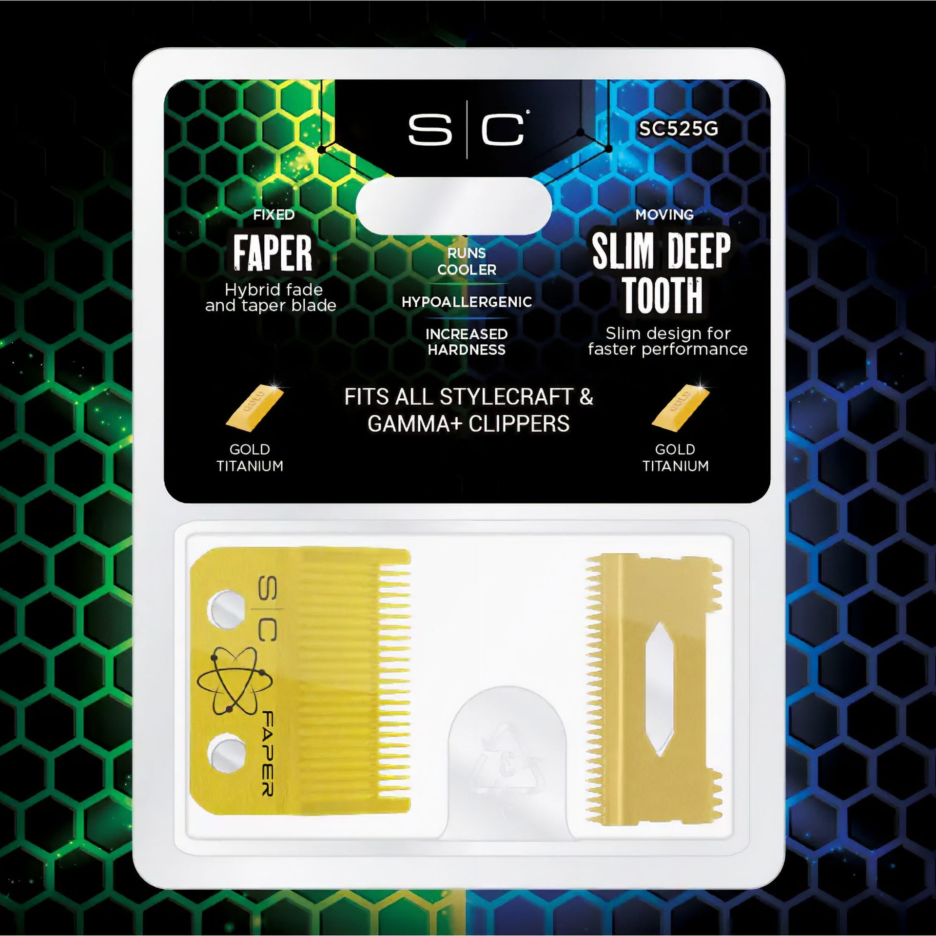 The StyleCraft SC Clipper Blade Gold Faper Blade & Gold Slim Deep Blade Set is designed to elevate your cutting experience, offering unmatched precision and durability. Crafted from the highest quality gold titanium, these blades are not only super sharp but also hypoallergenic, making them perfect for sensitive skin. Compatible with all StyleCraft and Gamma+ clipper models, this blade set ensures enhanced cutting performance, providing cleaner and smoother results with every use. The gold titanium construction also reduces the need for frequent blade changes, making them a time-saving and convenient choice for professional barbers. Whether you’re executing precise fades or general cutting, the sharp tips of the blades give you full control and accuracy, delivering professional results effortlessly.