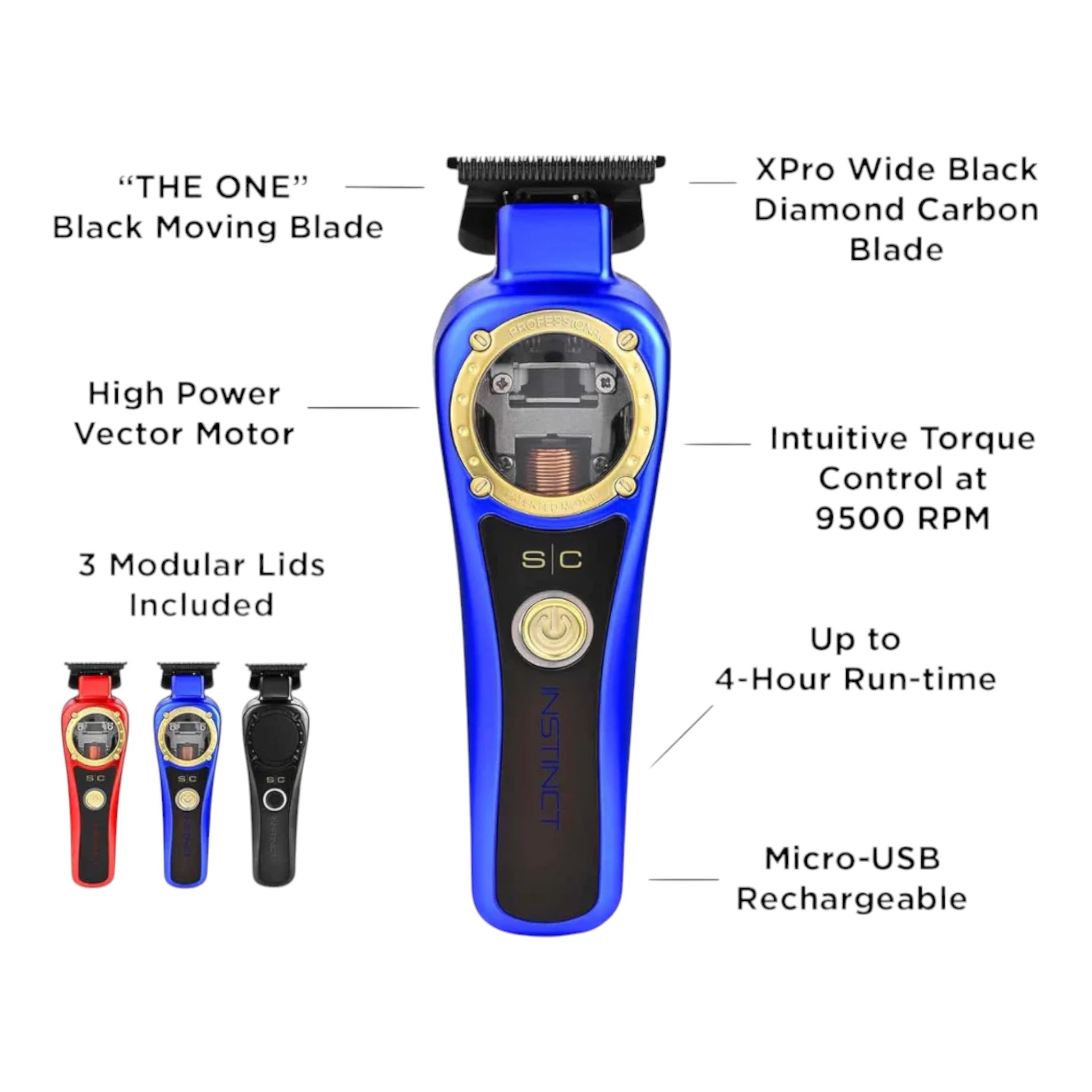 The StyleCraft SC Instinct Vector Motor Trimmer sets a new standard in professional trimming with its powerful Vector Motor, delivering an impressive 9,500 strokes per minute. Designed to eliminate snagging and pulling, this trimmer excels at bulk removal, providing barbers and stylists with the performance of a clipper in a compact, lightweight design. With its Black Diamond Carbon DLC X-Pro wide fixed blade and deep tooth cutting blade, it offers incredibly sharp lines and ultra-smooth cutting without drag. The lithium-ion battery ensures up to 4 hours of cordless runtime, and the trimmer recharges in just 2 hours using the convenient Micro-USB port, making it perfect for worldwide use. The open skeleton 360° design exposes the blade for cooler operation, improved sight lines, and enhanced precision, while the fully adjustable blade can be zero-gapped for the closest possible cut. The trimmer comes with 3 additional housing options, allowing for custom modifications and a transparent motor showcase for a personalised look.