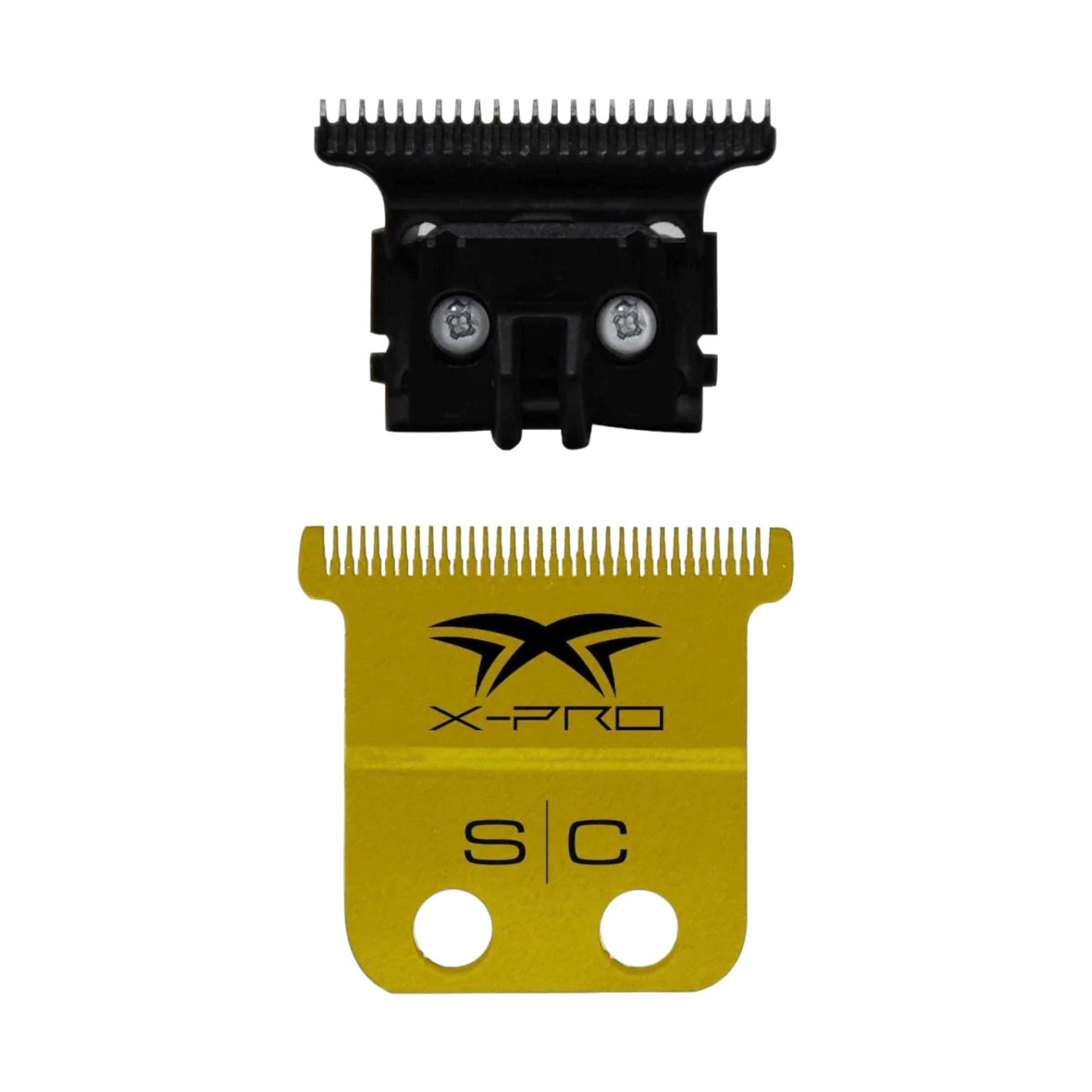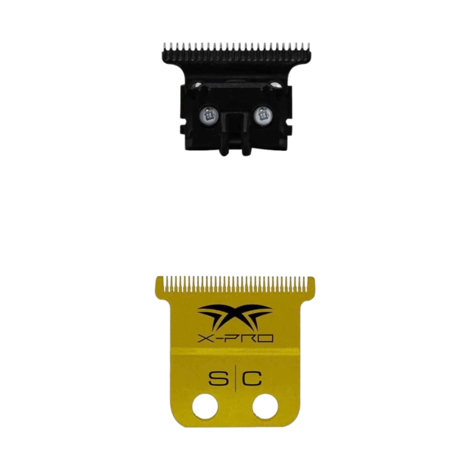 The StyleCraft SC Precision Blade Set - X-Pro Gold and The One is designed for professionals seeking exceptional precision and durability. The Gold Titanium X-Pro fixed blade, crafted with a unique Japanese convex and hollow grinding process, ensures superior sharpness and balance for extreme precision. Finely polished to 32mm, this blade excels at fine detailing and sharp line work, making it ideal for both all-round cutting and intricate styling. The hypoallergenic properties of the Gold Titanium blade are perfect for sensitive skin, offering a smooth, irritation-free experience. In addition, the set includes "The One" Black Diamond Carbon DLC moving blade, featuring bevelled teeth for the closest, smoothest cuts. The deep-tooth design of the moving blade ensures it stays cooler, rust-free, and sharper for longer, even with heavy use.