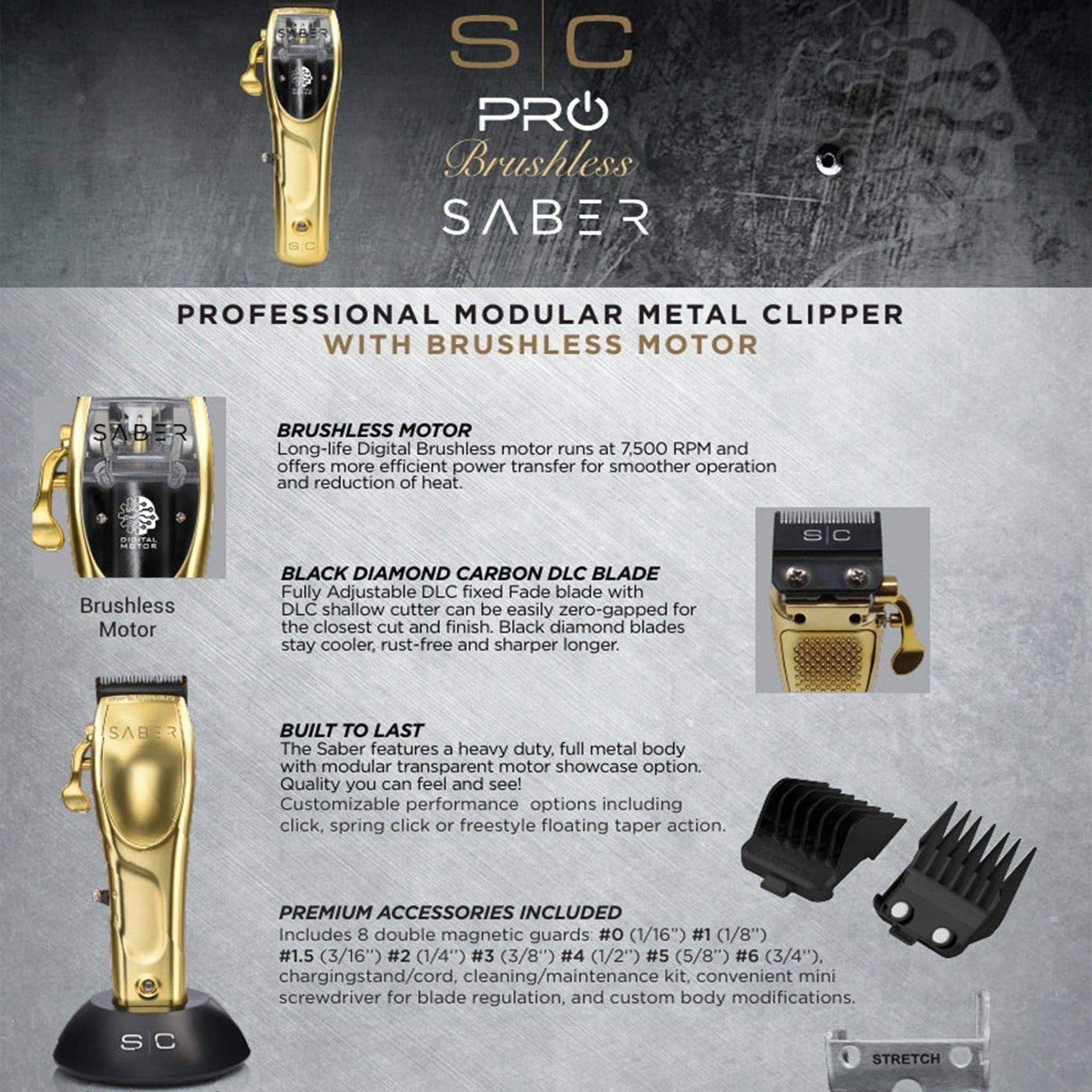 The StyleCraft SC Saber Brushless Motor Metal Clipper is a top-tier tool designed for professional barbers and stylists, offering exceptional power and precision. Powered by a digital brushless motor running at 7,500 strokes per minute, this clipper ensures an efficient and smooth cut, even on the thickest hair types. The motor is paired with premium double Black Diamond Carbon DLC blades, which provide superior cutting performance without any snags. These blades are non-corrosive, staying rust-free, cooler, and sharper for longer, ensuring a professional-grade finish every time. The clipper’s heavy-duty full metal body adds durability, while its lightweight design ensures comfort during extended use. Whether you’re blending, fading, or detailing, the SC Saber delivers consistent results with minimal noise and vibration, making it an ideal choice for busy barbershops.