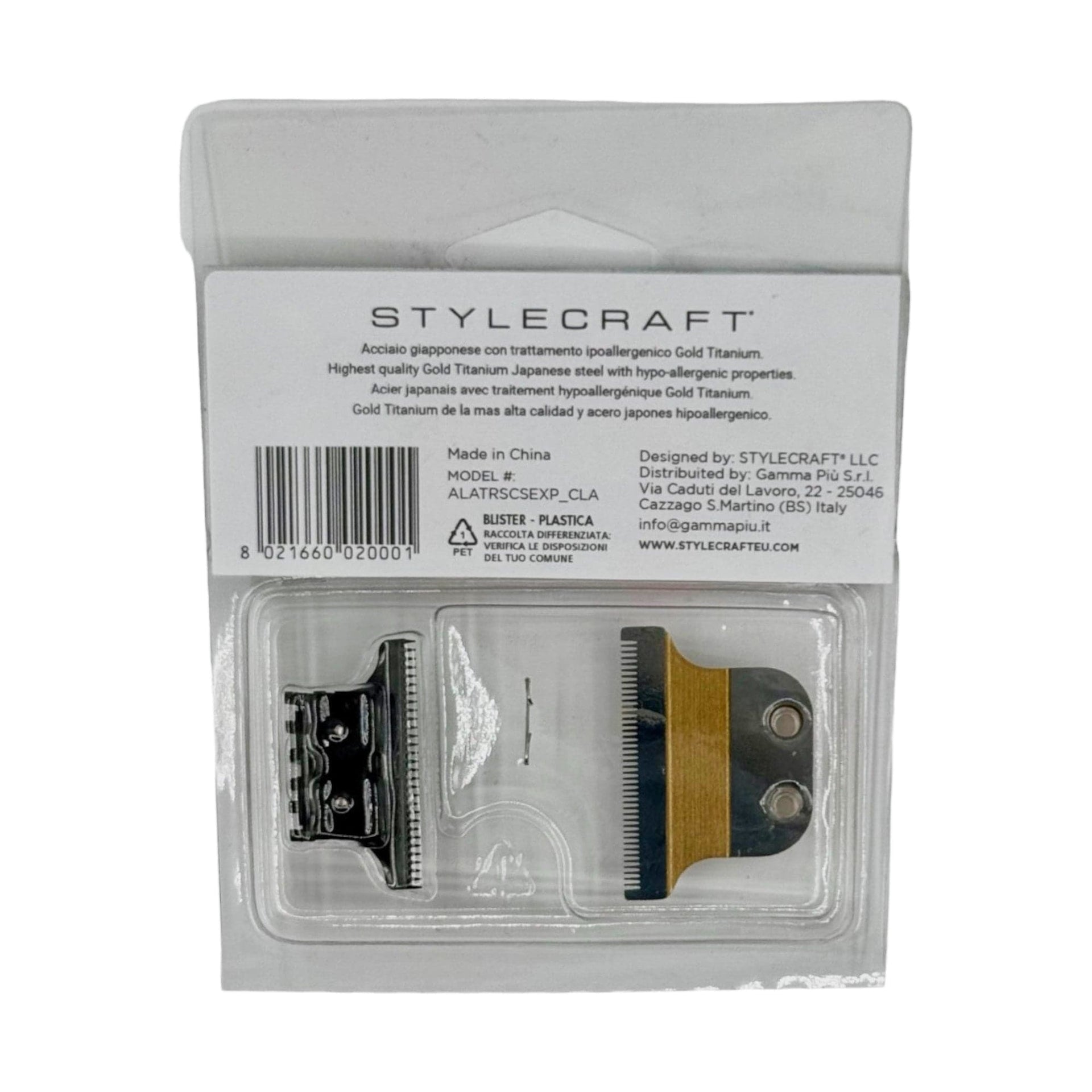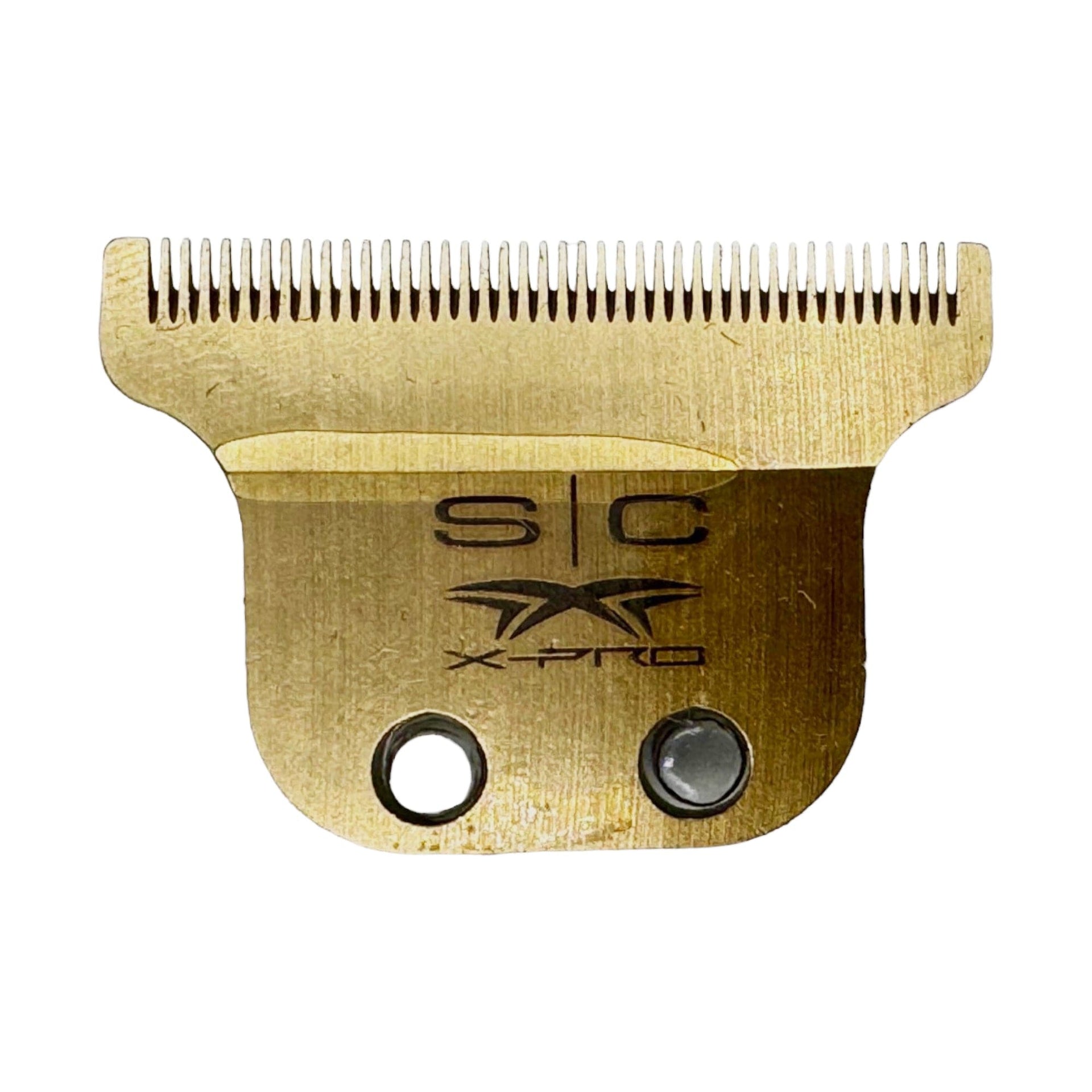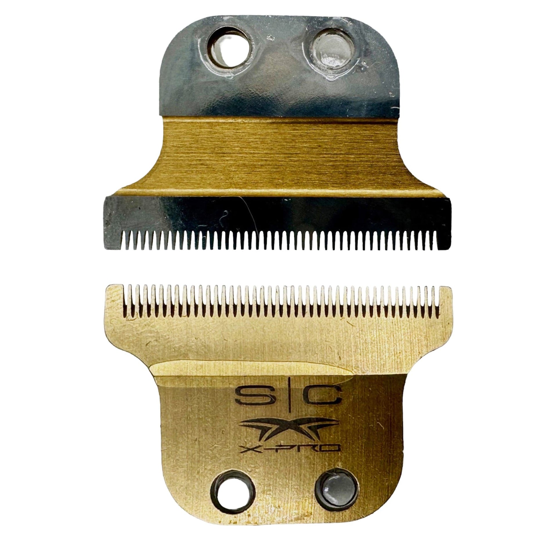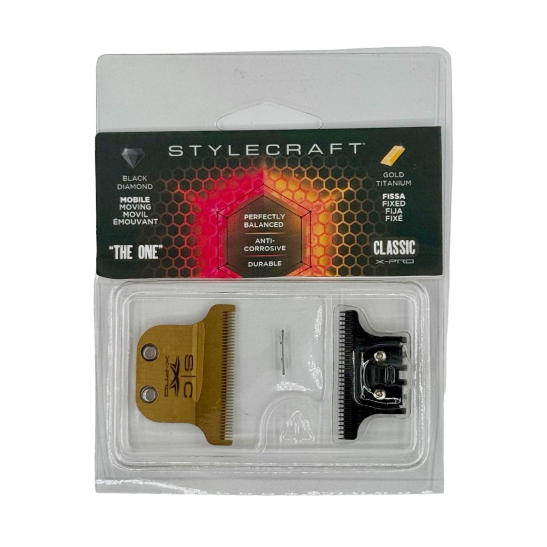 The Stylecraft SC Trimmer Blade Set - X-Pro Classic Gold & The One offers a premium solution for professionals seeking superior precision and durability. Featuring a hypoallergenic Gold Titanium X-Pro fixed blade, this set is ideal for sensitive skin while delivering a precise and smooth trim. The moving blade, known as "The One," is equipped with bevelled teeth for extra close cutting, ensuring a flawless finish every time. Manufactured with deep tooth technology, these blades stay cooler, resist rust, and maintain sharpness for prolonged use, making them the perfect choice for barbers and stylists. Compatible with all StyleCraft and Gamma+ trimmers, this blade set offers unparalleled versatility and performance.