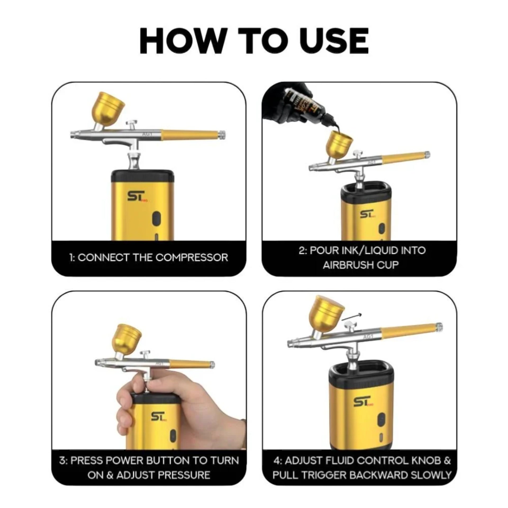 - Included Accessories: 1 x ST Pro Compressor, 1 x Airbrush Gun (AG1), 2 x Interchangeable Fluid Cups, 1 x USB-C Cable, 1 x Black Colour Enhancement (60ml), 1 x Airbrush Cleaner (60ml)