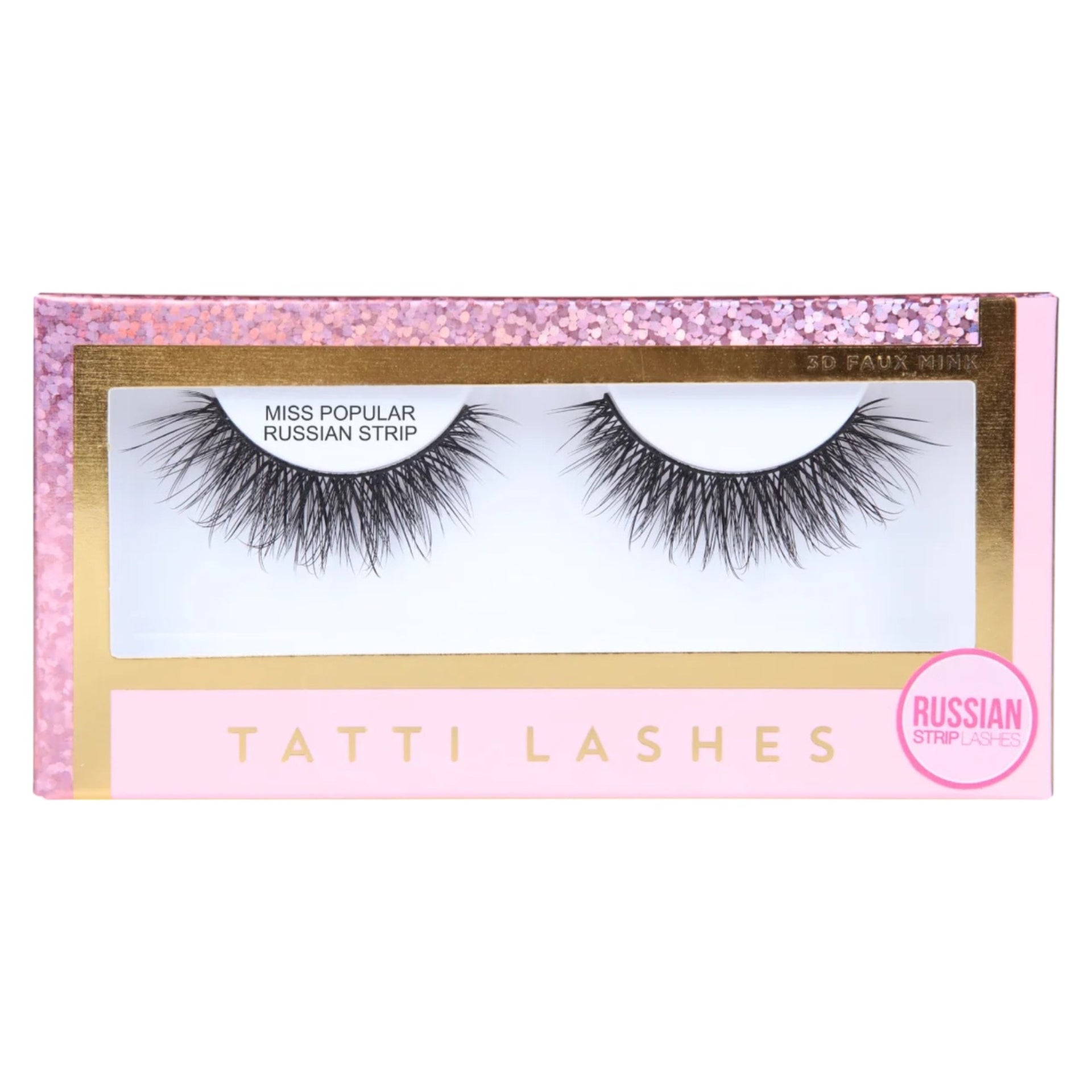 The Tatti Lashes - Miss Popular Russian Strip Lashes are fashioned from the highest quality synthetic fibres, ensuring they are lightweight, comfortable for extended wear, and remarkably durable. Designed for multiple uses, these lashes can be worn 15-20 times with proper care, making them a cost-effective addition to any makeup collection. Each pack conveniently includes adhesive, so you have everything required for immediate application. Their versatile short to medium length and glamorous style make them perfect for a wide array of eye shapes and occasions. Elevate your look with these effortlessly glamorous strip lashes.