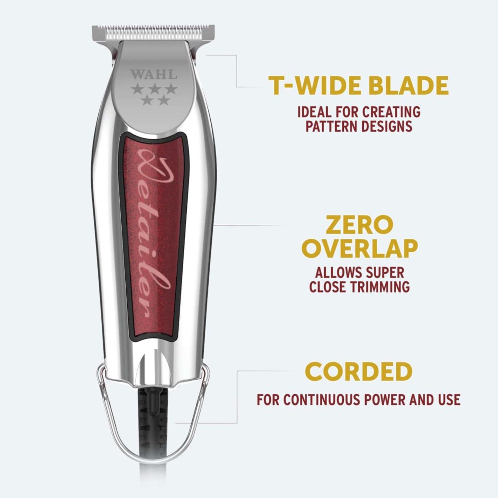 The Wahl 5 Star Detailer Trimmer stands as the premier choice for professional edge lining and detailed styling work, featuring an extra-wide T-shaped blade for superior precision. Powered by a professional rotary motor delivering 5,500 RPM, this trimmer excels in creating crisp lines and intricate patterns with exceptional accuracy. The zero-overlap adjustment capability enables extremely close cutting, making it perfect for precise shape-ups and immaculate beard line definition.