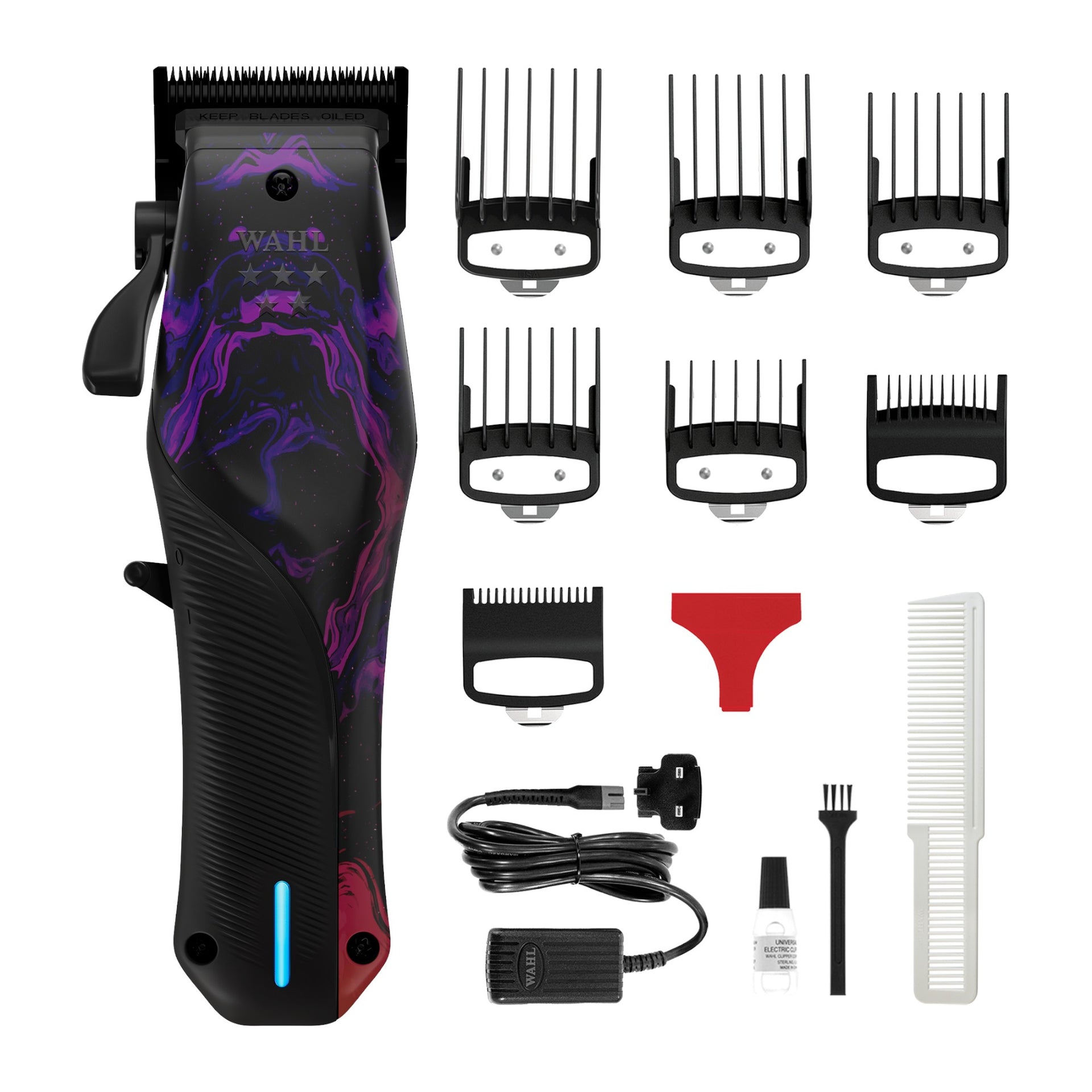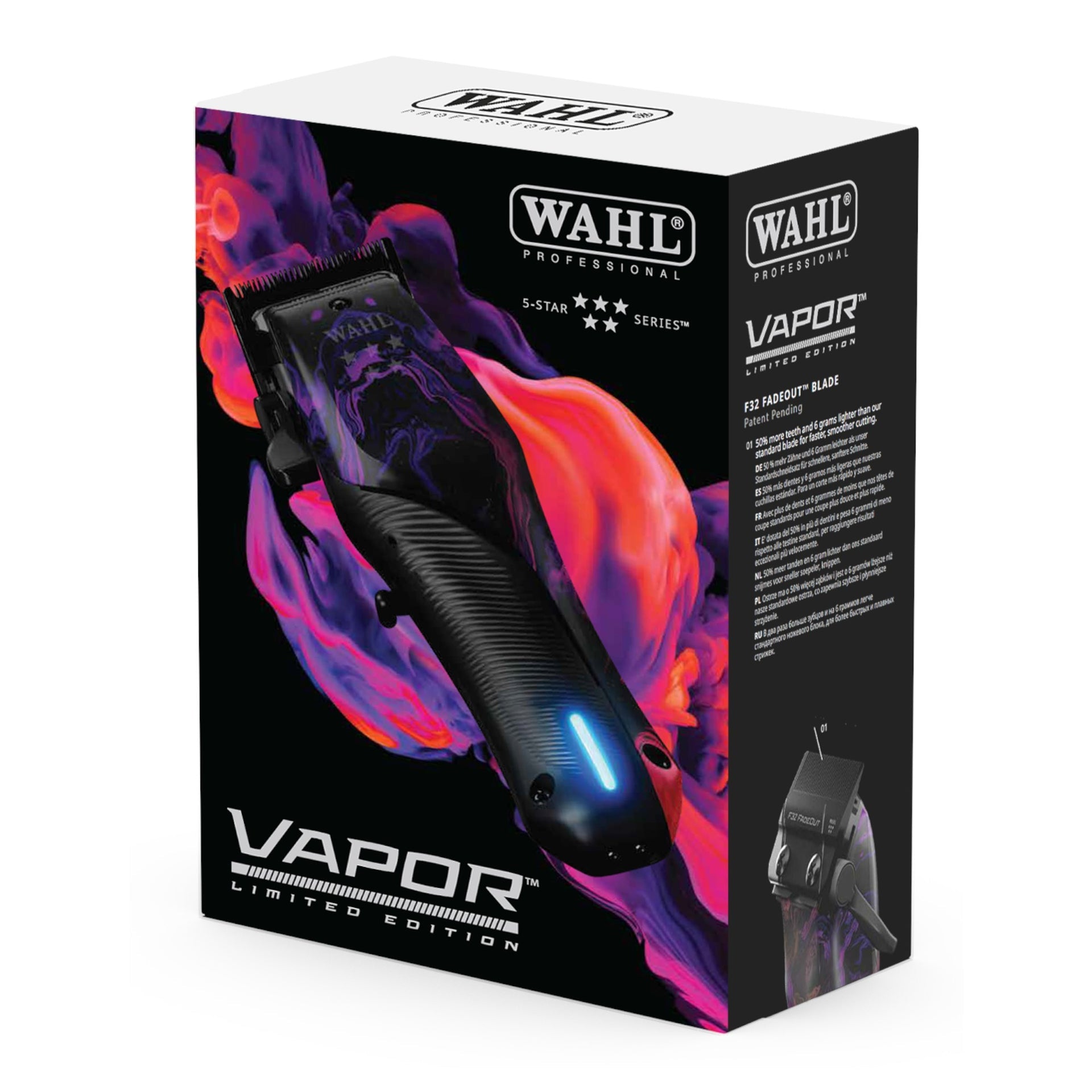 Introducing the Wahl - 5 Star Vapor Clipper Limited Edition, the latest stand-out leap in professional barbering technology, featuring a unique, hydro-dipped design on every single clipper. This tool revolutionises fading with its brand-new F32 FADEOUT™ blade, an innovative adjustable balding blade that allows you to go from bald to fade (0.5mm - 1.2mm) without needing to swap blades. Made from high-carbon steel with PVD and DLC coatings, this advanced blade is ultra-strong, rust-resistant, and remains sharp up to four times longer than standard steel blades. Its design, with 50% more teeth, provides an exceptionally efficient and comfortable cutting experience.