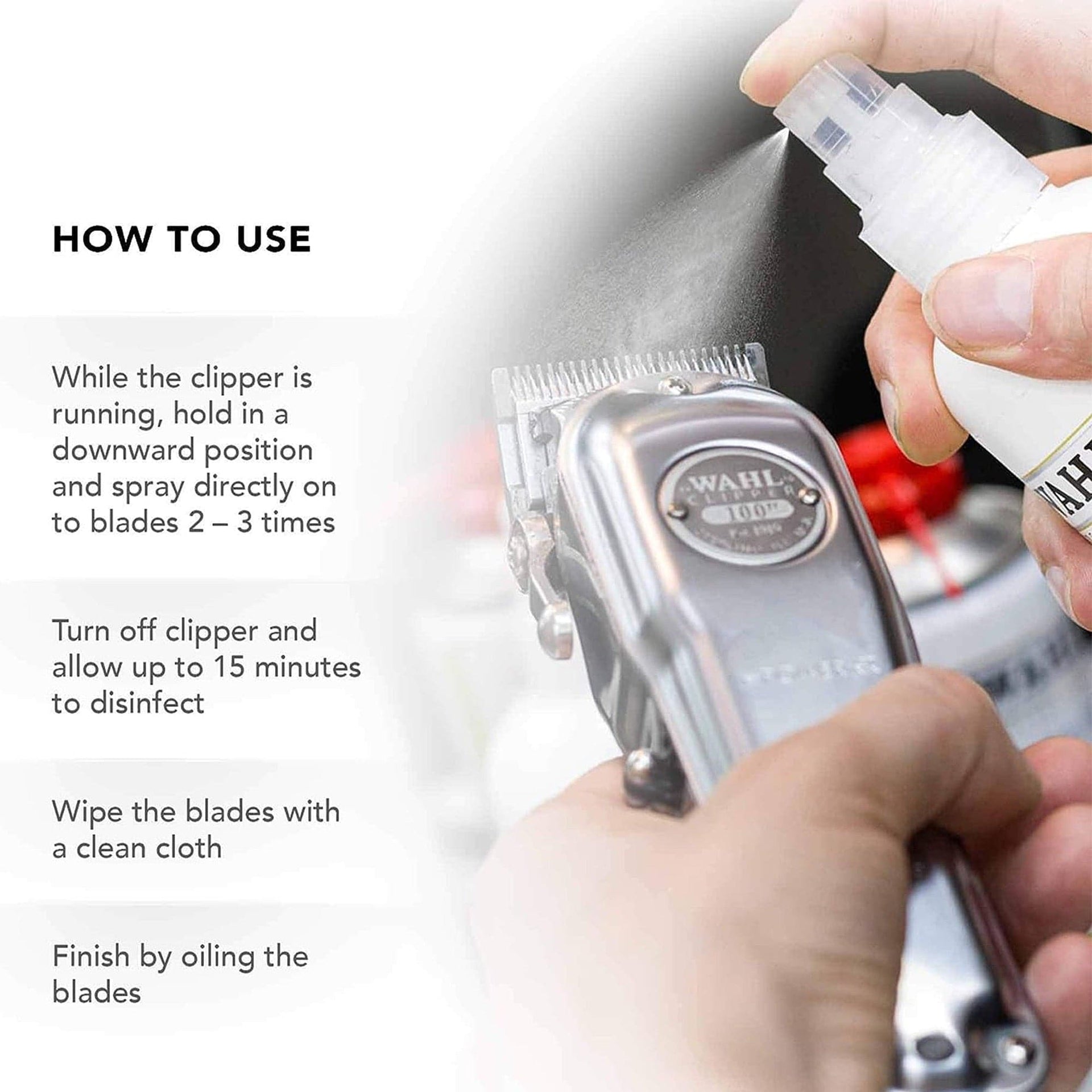 Spray directly onto blades and allow recommended contact time: 5 minutes for bacteria, 15 minutes for yeasts and viruses. Use between clients and at end of day.