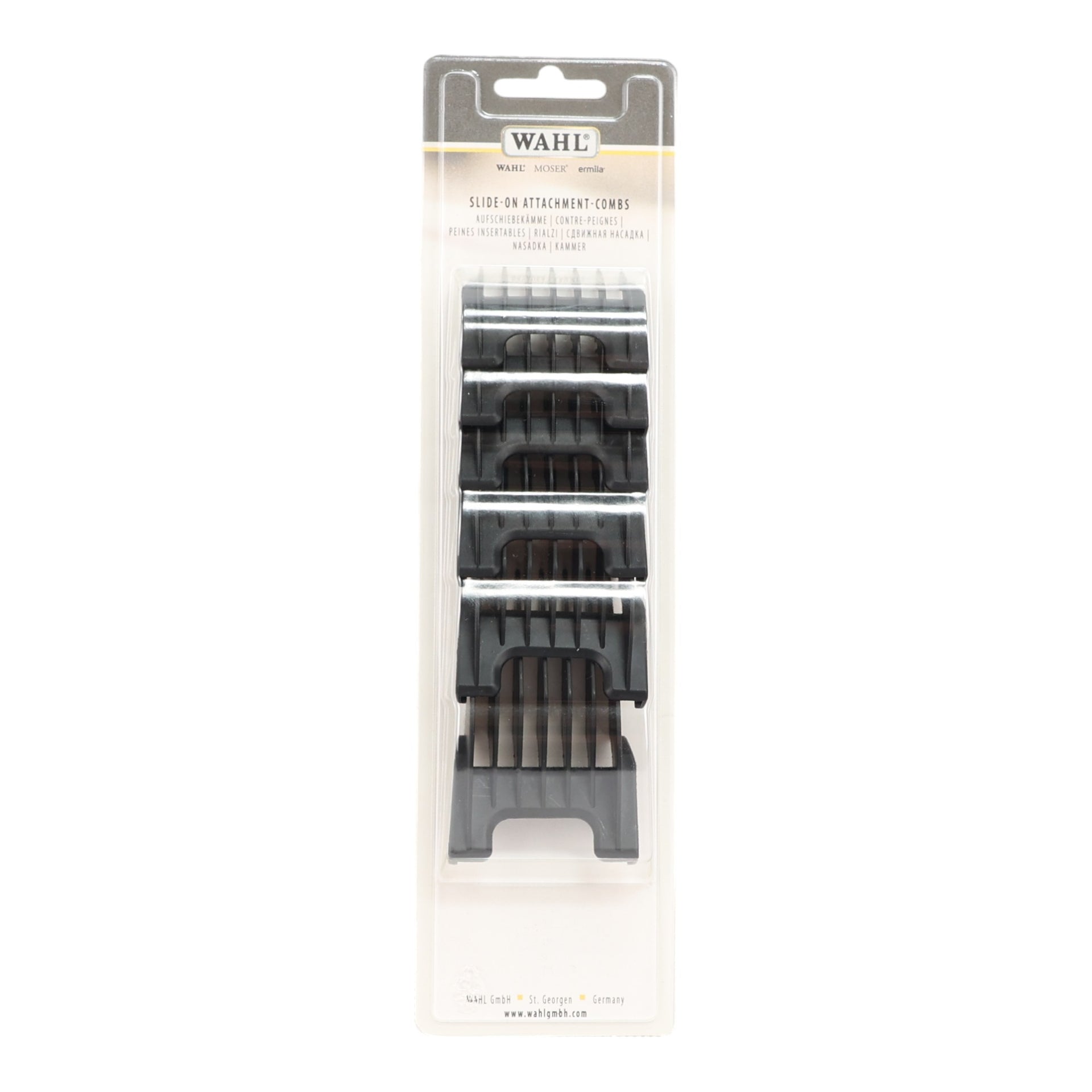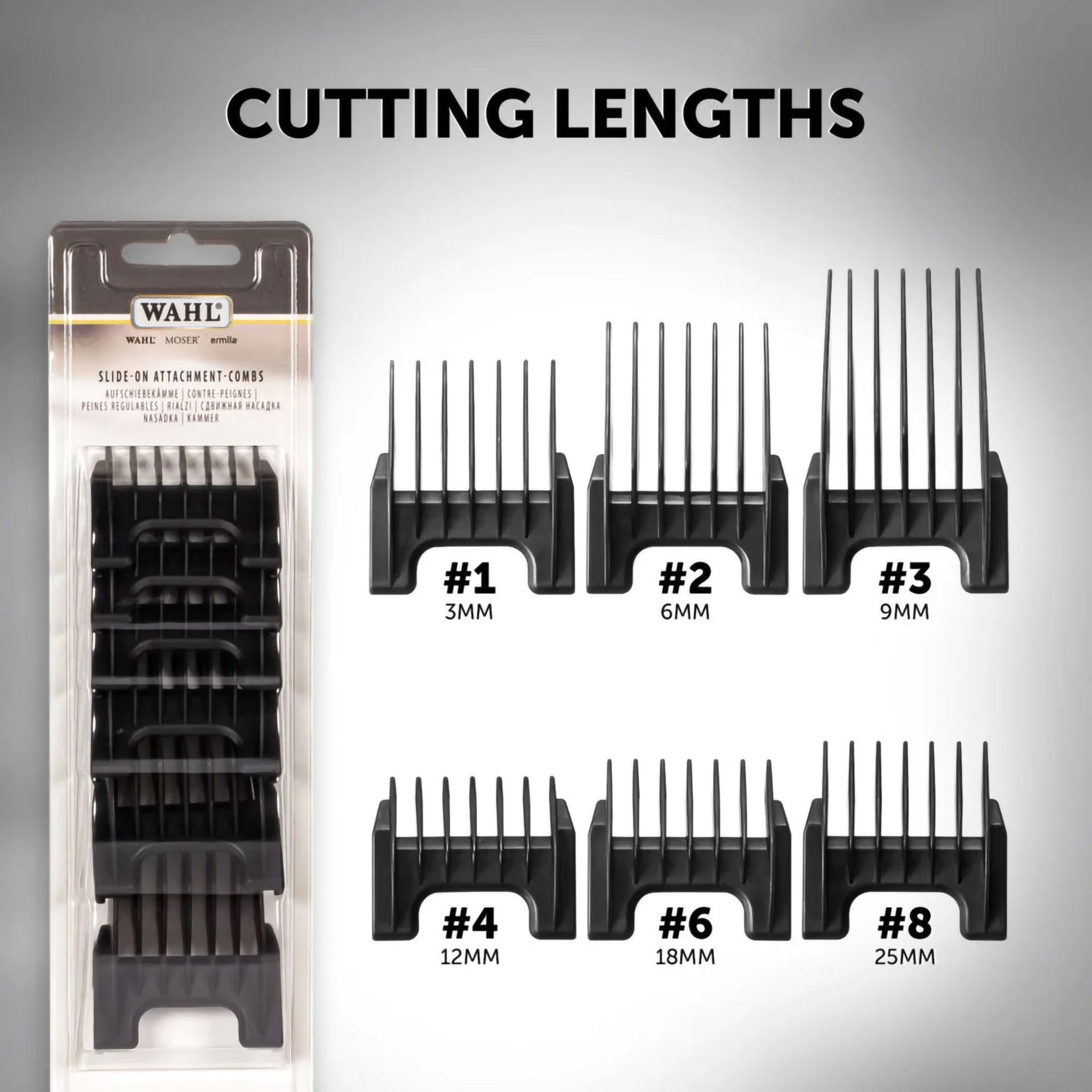 The Wahl Slide-on Attachment Combs Guards Set is a comprehensive collection of six professional-grade cutting attachments designed for versatile styling applications. This essential set includes precisely engineered guards ranging from 3mm to 25mm, providing complete coverage for all standard cutting lengths. Compatible with popular professional models including Chromstyle, Bellissima, Bellina, Li Pro 2, Motion, Beretto, and Rex clippers, these attachments deliver consistent and reliable cutting performance.