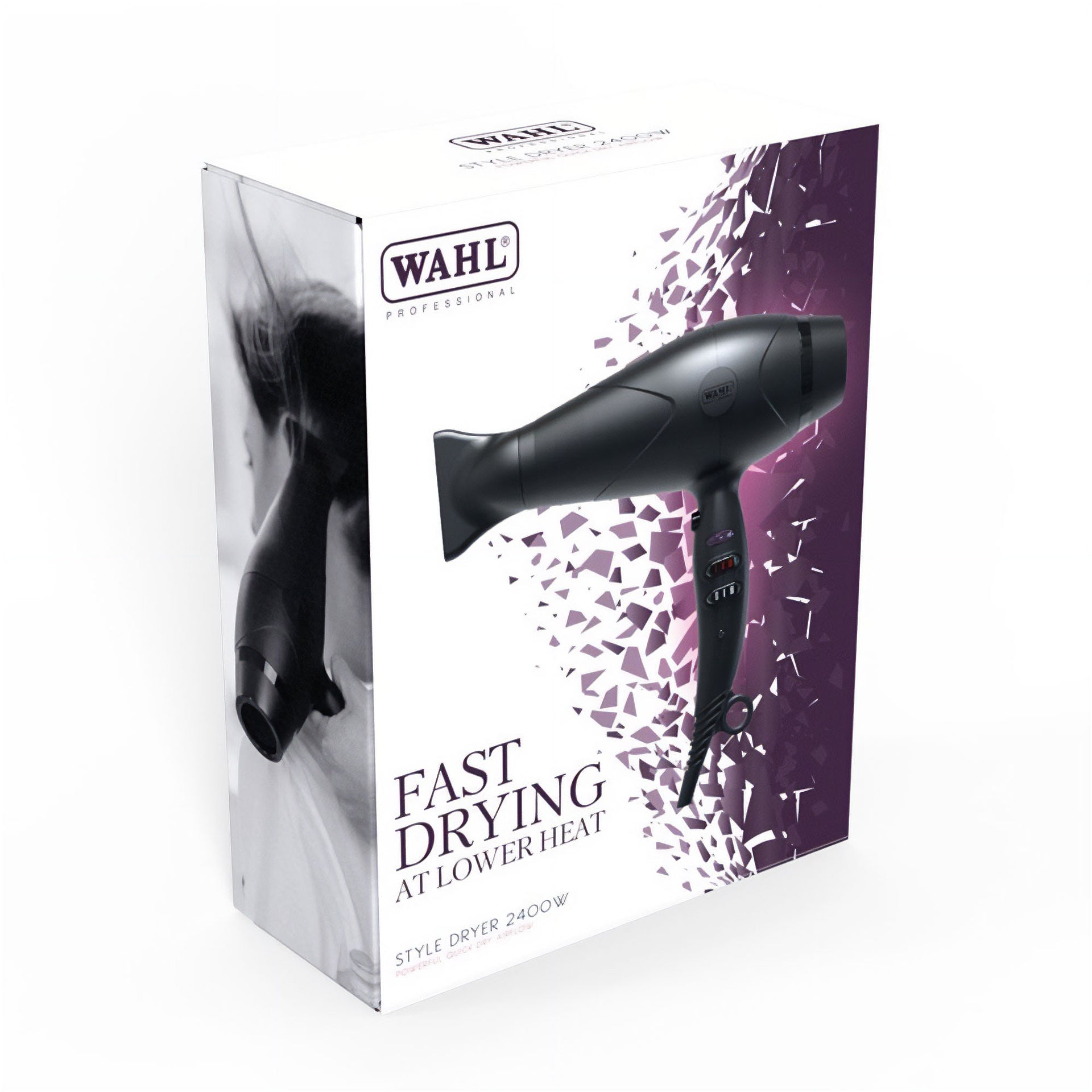 The Wahl Style Collection Dryer 2400W is a high-performance hairdryer designed to deliver salon-quality results at home or in professional settings. Powered by a 2400W motor and equipped with Quick Dry Airflow technology, it ensures faster drying at lower temperatures, protecting hair from heat damage. This dryer offers 3 heat settings and 2 speed options, including a Turbo Heat function for extra drying power and a Cool Shot button to lock in your style. The ionic function reduces static and frizz, leaving your hair smooth, sleek, and shiny after every use.