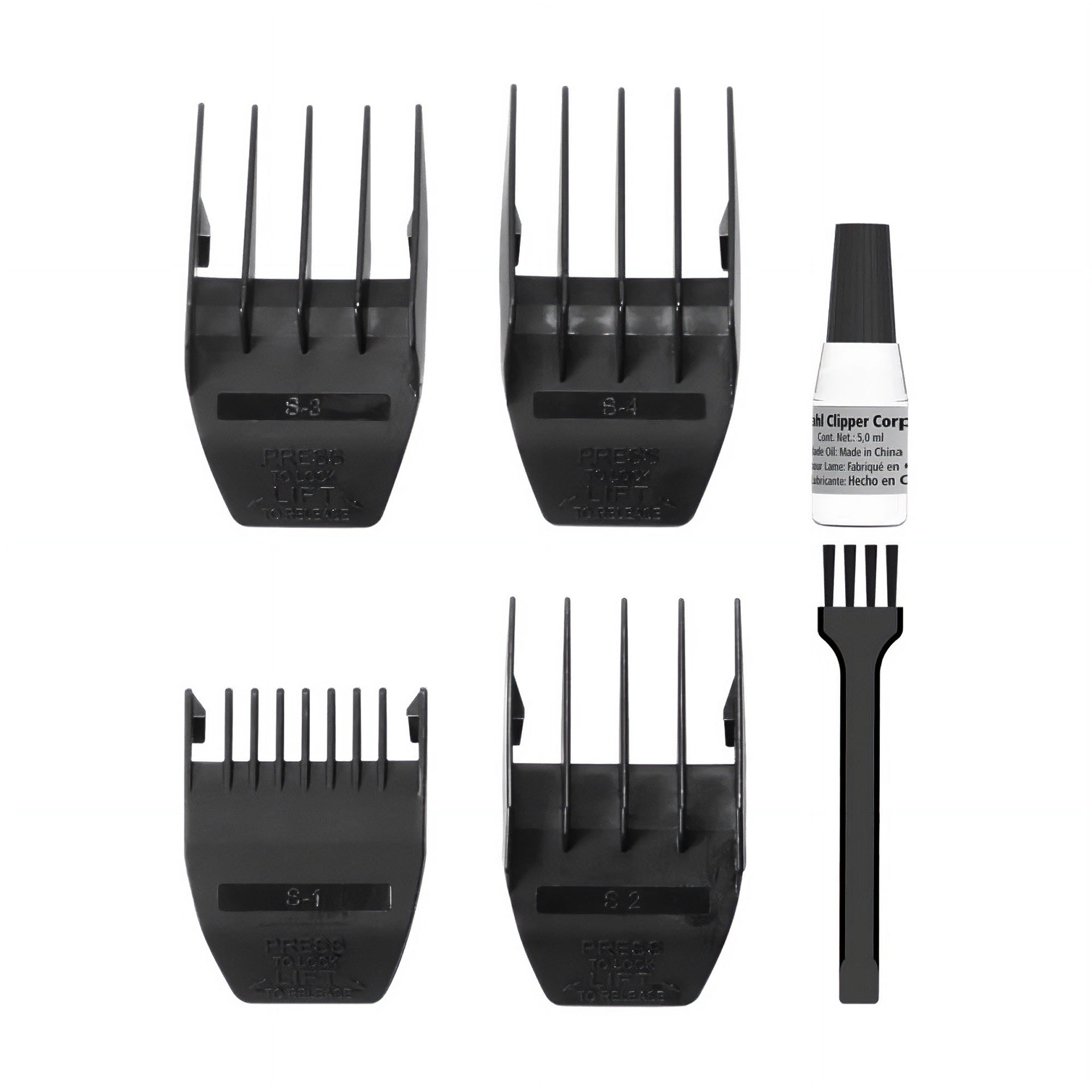 The Wahl Trimmer Attachment Comb Guard Set is a comprehensive collection of four professional-grade cutting attachments designed for versatile trimming applications. This essential set includes precision-engineered guards ranging from 3mm to 13mm, compatible with popular professional models including the Academy Trimmer, Sterling 2, Super Micro and Beret. Each attachment is crafted to deliver consistent cutting results while maintaining the durability required for intensive salon use.