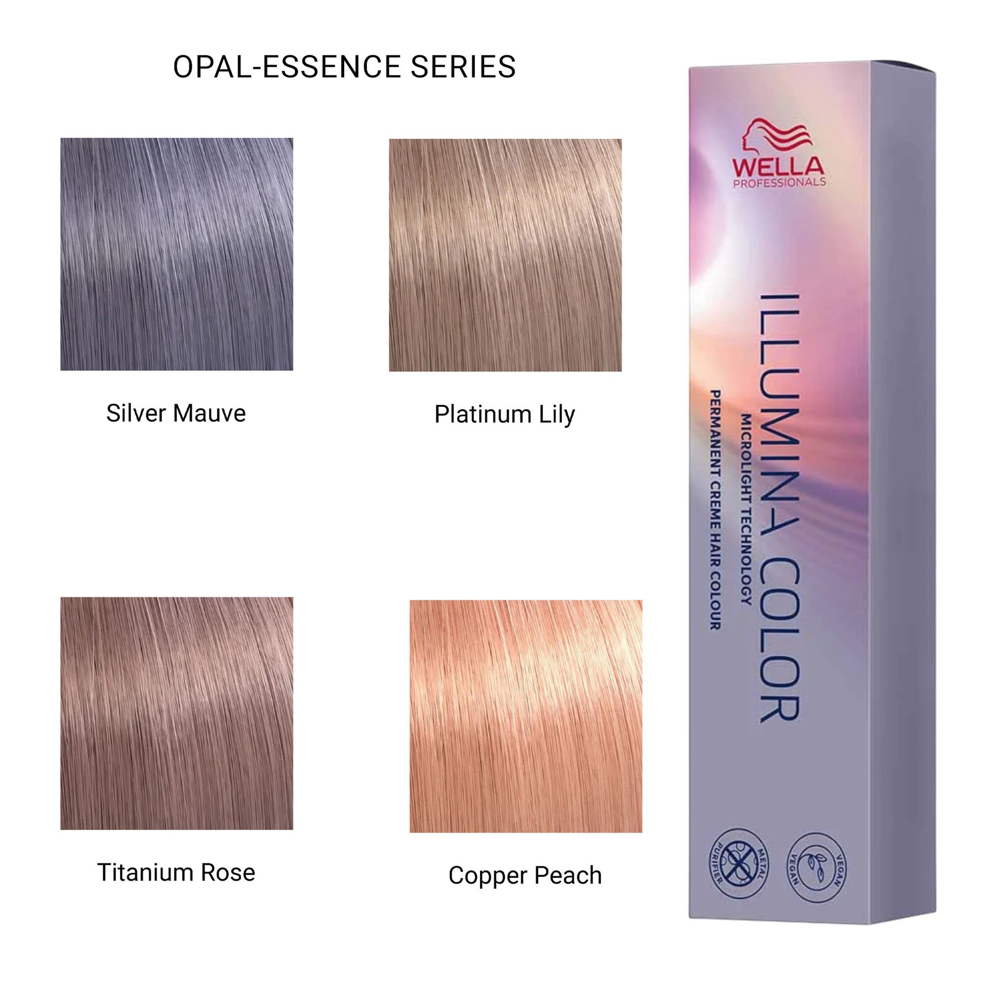 Step into the world of sophistication with this premium collection of metallic-infused permanent hair colours that deliver ethereal, multidimensional results with exceptional luminosity. The Illumina Opal-Essence Series represents the pinnacle of colour innovation, featuring revolutionary Microlight technology that surrounds copper deposits on the hair cuticle, preventing them from interfering with colour development whilst increasing cuticle protection for smoother, clearer cuticles that allow light to pass through freely. This carefully curated collection of four bespoke shades—Silver Mauve, Platinum Lily, Titanium Rose, and Copper Peach—offers a sophisticated palette of metallic-inspired tones that create subtle, refined opalescent effects rather than bold fashion colours. The innovative formula illuminates the hair's natural highlights and lowlights from within, creating multidimensional metallic tones that shift and change in different lighting conditions, mimicking the captivating play of light seen in precious opals and metals. Whether creating icy lavender-silver hues, delicate platinum-blonde effects, soft rose-gold dimensions, or subtle peachy-copper reflects, this collection elevates hair colour to a new realm of sophisticated elegance.