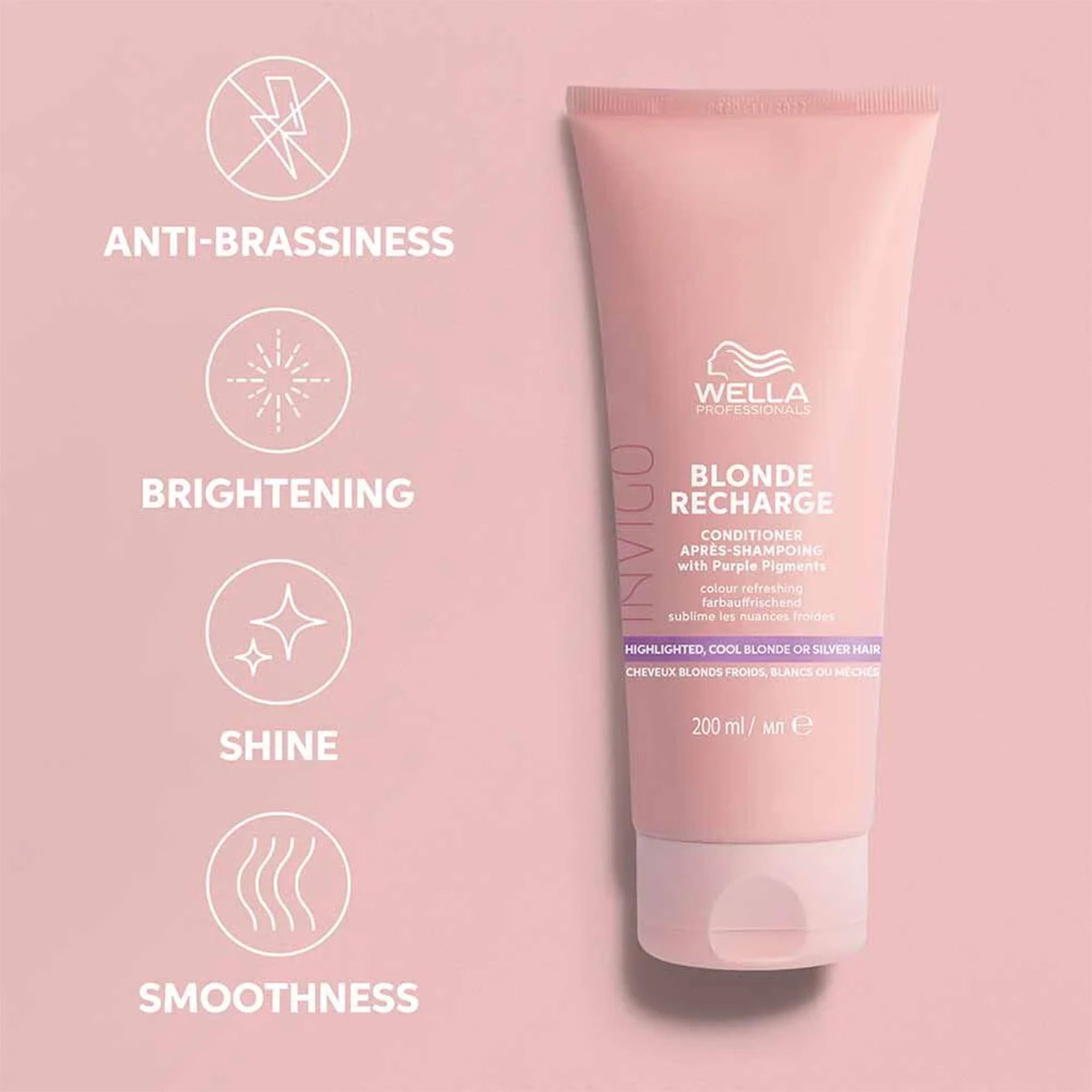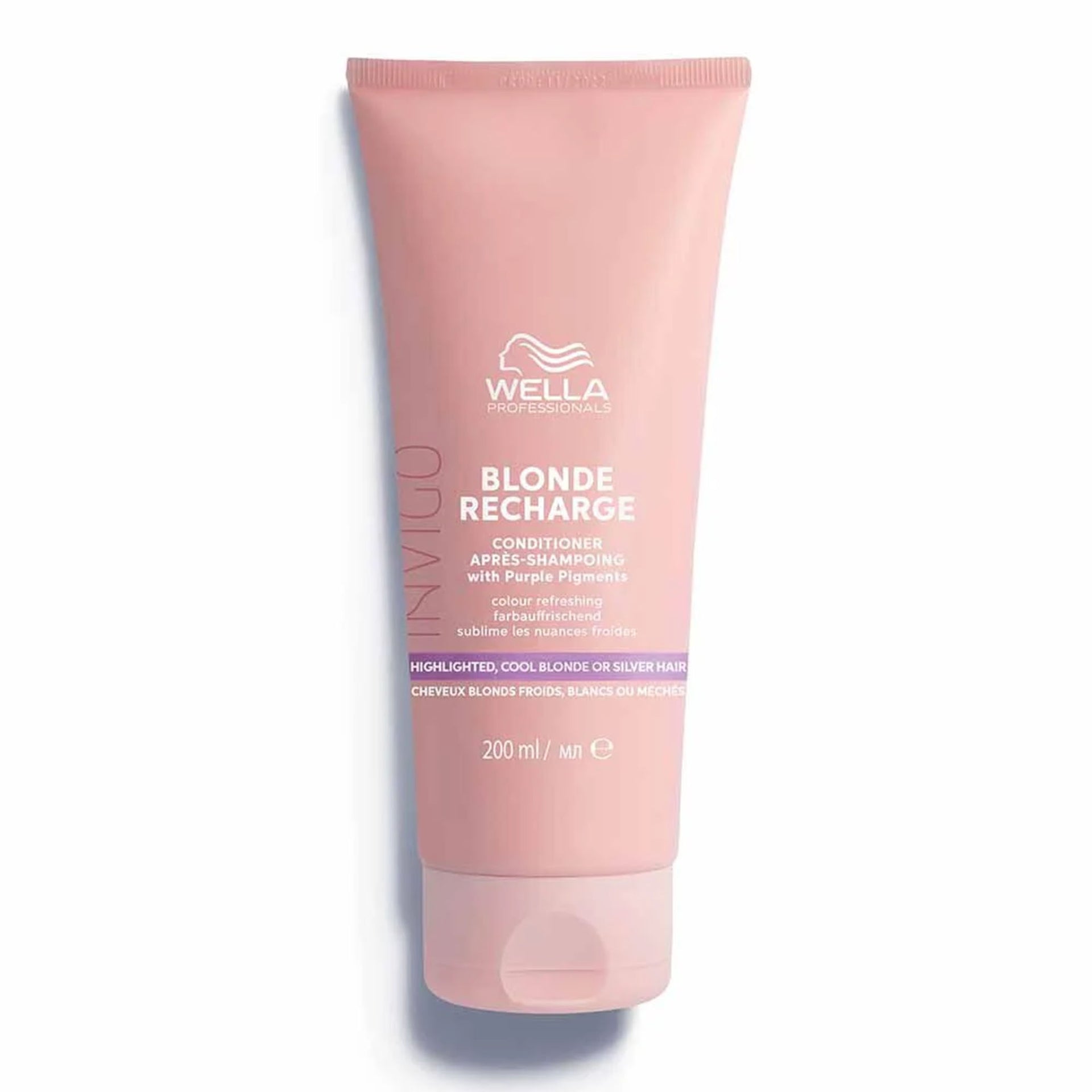Wella Professionals Invigo Blonde Recharge Conditioner delivers professional-grade colour maintenance specifically formulated to refresh and preserve the multi-dimensional beauty of cool blonde tones. This sophisticated 200ml formula represents the perfect solution for maintaining salon-fresh cool blonde, highlighted, or silver hair between appointments, featuring carefully calibrated purple pigments that effectively neutralise unwanted warm tones whilst enhancing the cool dimension of blonde hair. Unlike conventional purple conditioners that can be drying or overly pigmented, this advanced formula balances colour refreshment with intensive conditioning benefits, ensuring that blonde hair receives the specialised moisture it needs without compromising on brass-neutralising efficacy. The luxurious texture provides substantial conditioning whilst depositing the perfect amount of cool-toned pigment, creating smoother, more manageable hair with enhanced brightness and refreshed cool tones that resist brassiness.