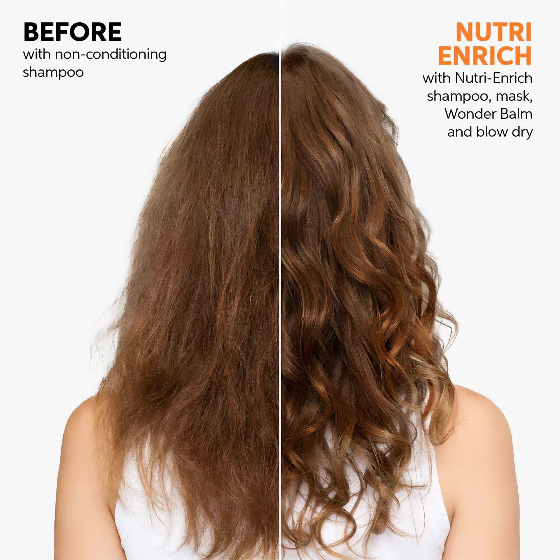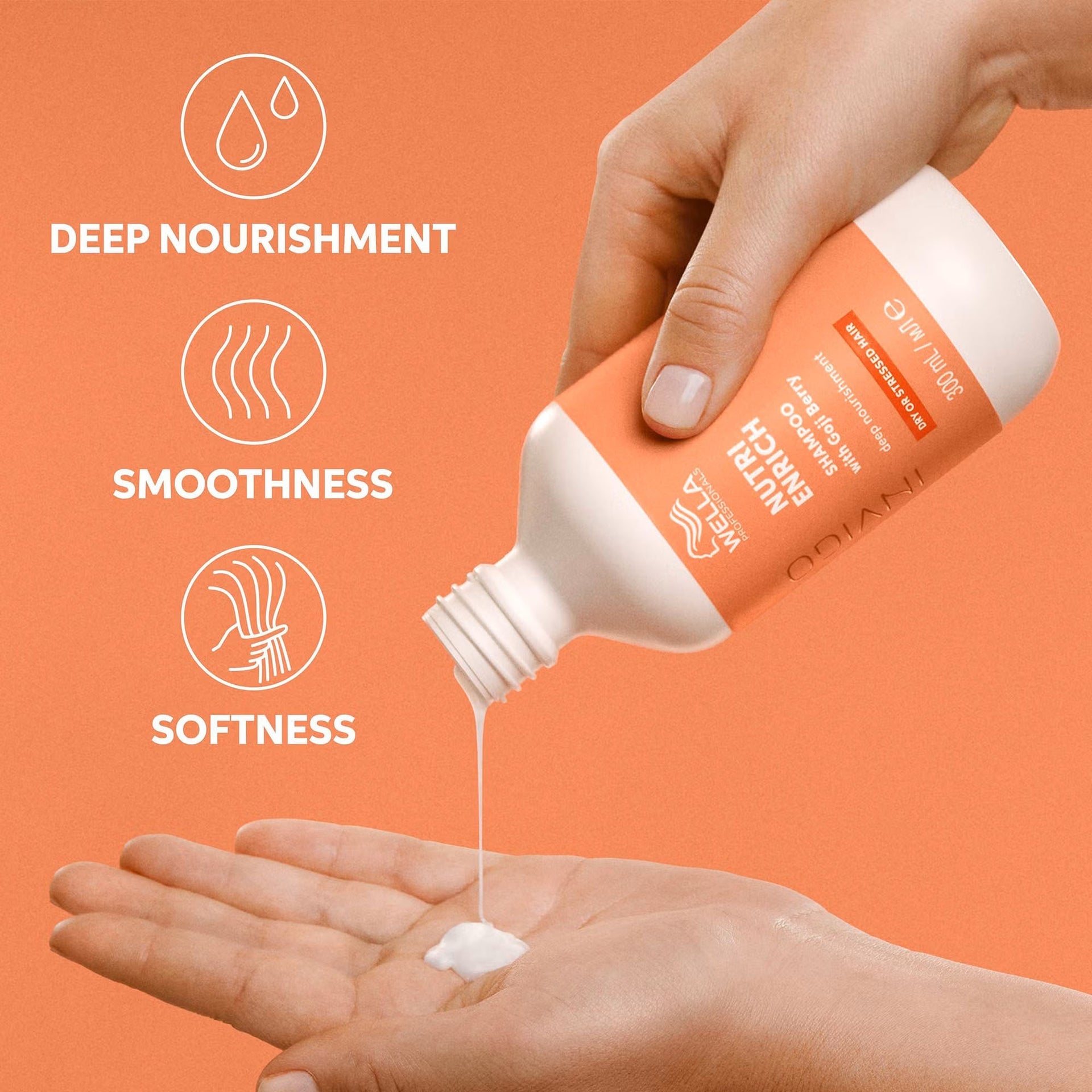 Apply to wet hair, gently massage into scalp and through to ends, allowing the nourishing formula to cleanse and begin conditioning for 1-2 minutes before rinsing thoroughly. For optimal results, follow with Invigo Nutri Enrich Conditioner and Deep Nourishing Mask 1-2 times weekly; use regularly for progressively improved hair condition.