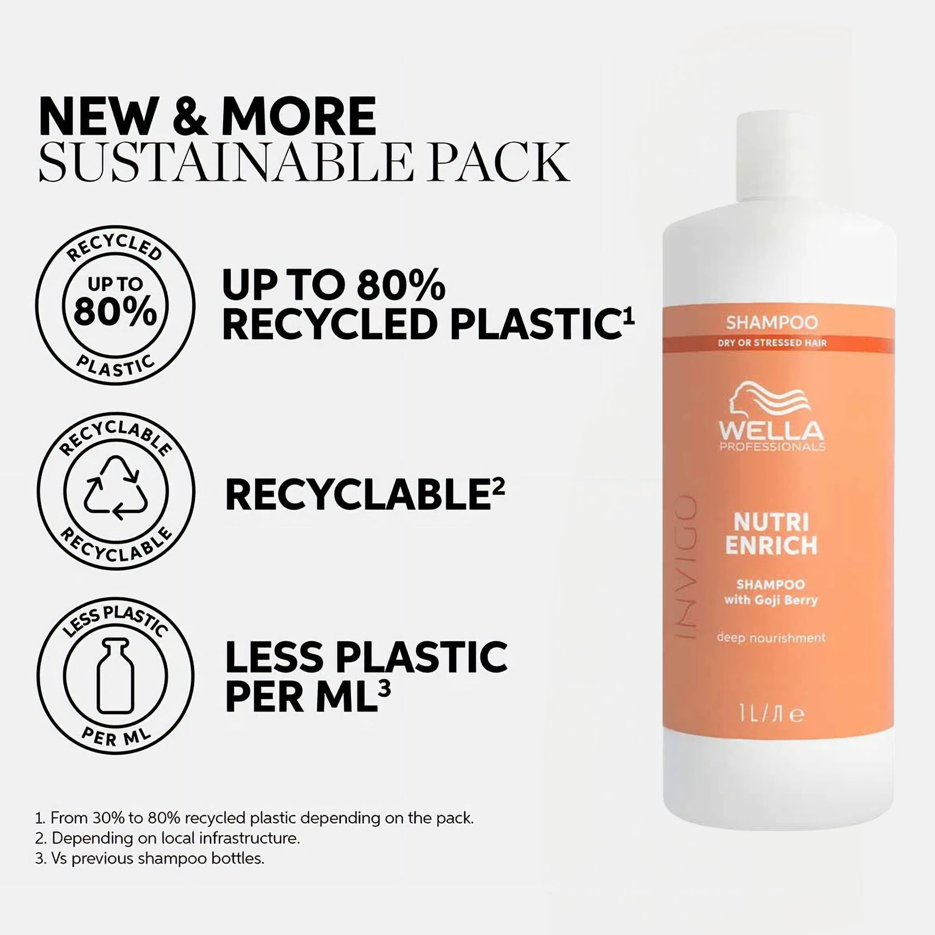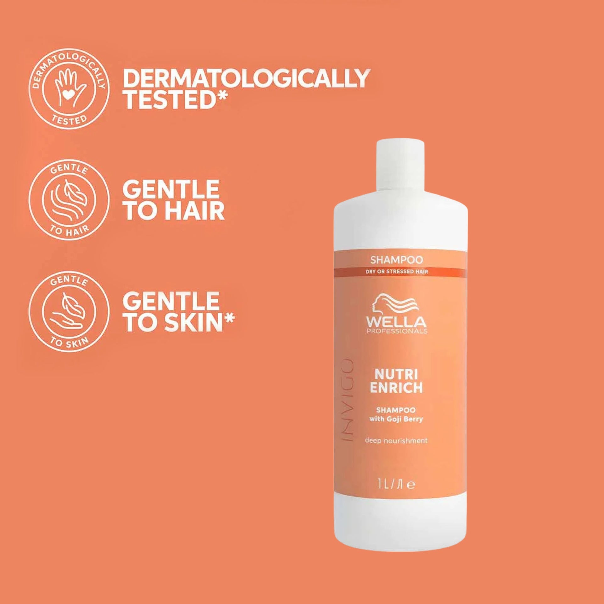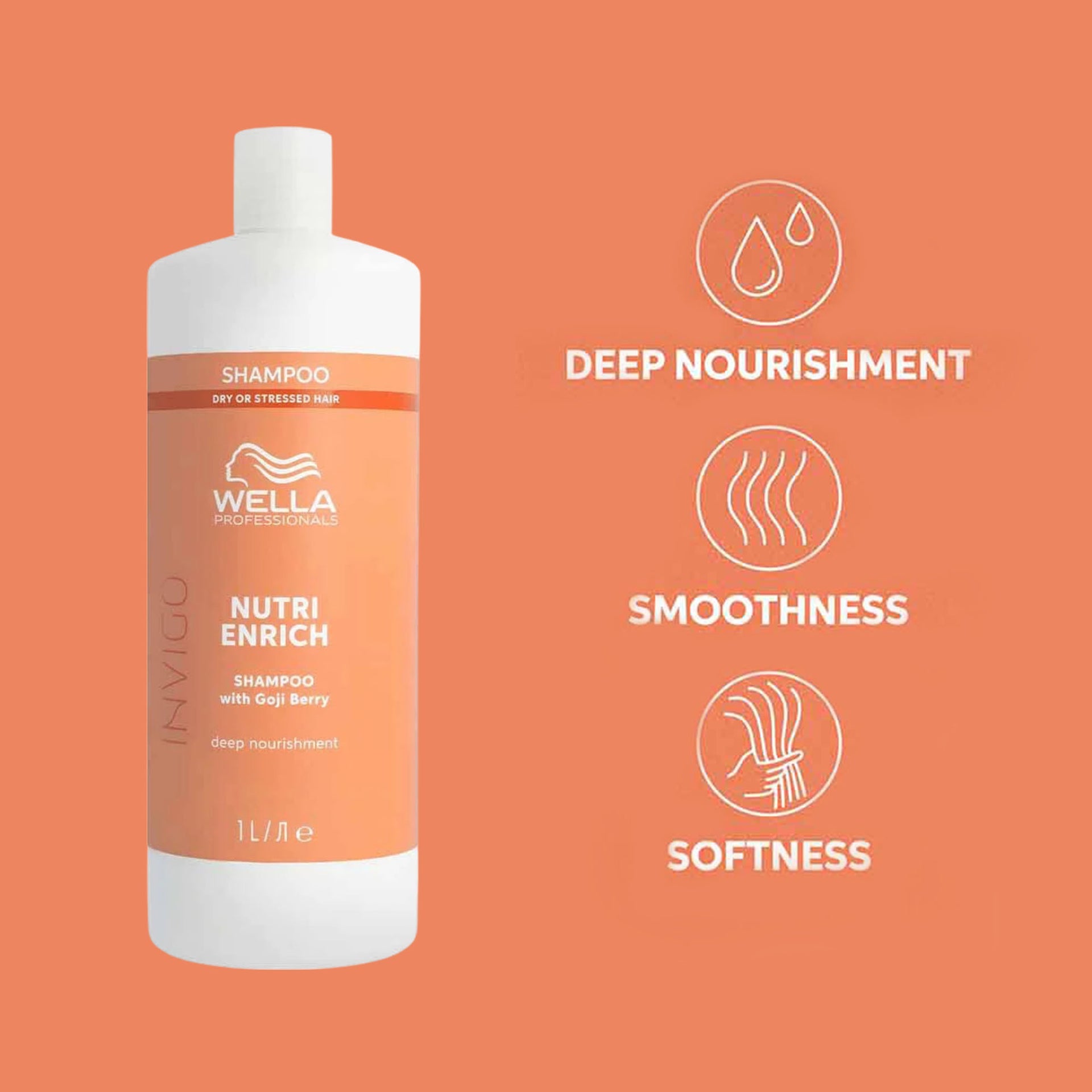 Transform dry, stressed hair into silky, nourished strands with this professional-grade deep conditioning shampoo. Invigo Nutri Enrich Shampoo represents the pinnacle of moisturising technology, featuring an advanced formula that delivers intense hydration whilst gently cleansing even the most parched hair types. Available in two convenient sizes—300ml for everyday home use and 1000ml for salon environments or economical family use—this comprehensive solution addresses multiple symptoms of dry, damaged hair in one luxurious treatment. The innovative formulation contains Nutri Enrich Complex with Goji Berry, exceptionally rich in vitamins, minerals and peptides that penetrate deep into the hair shaft, restoring vitality from within. Unlike standard moisturising shampoos that can leave residue or weigh hair down, this sophisticated cleanser provides substantial nourishment whilst maintaining natural movement, creating smooth, manageable results that feel as good as they look.